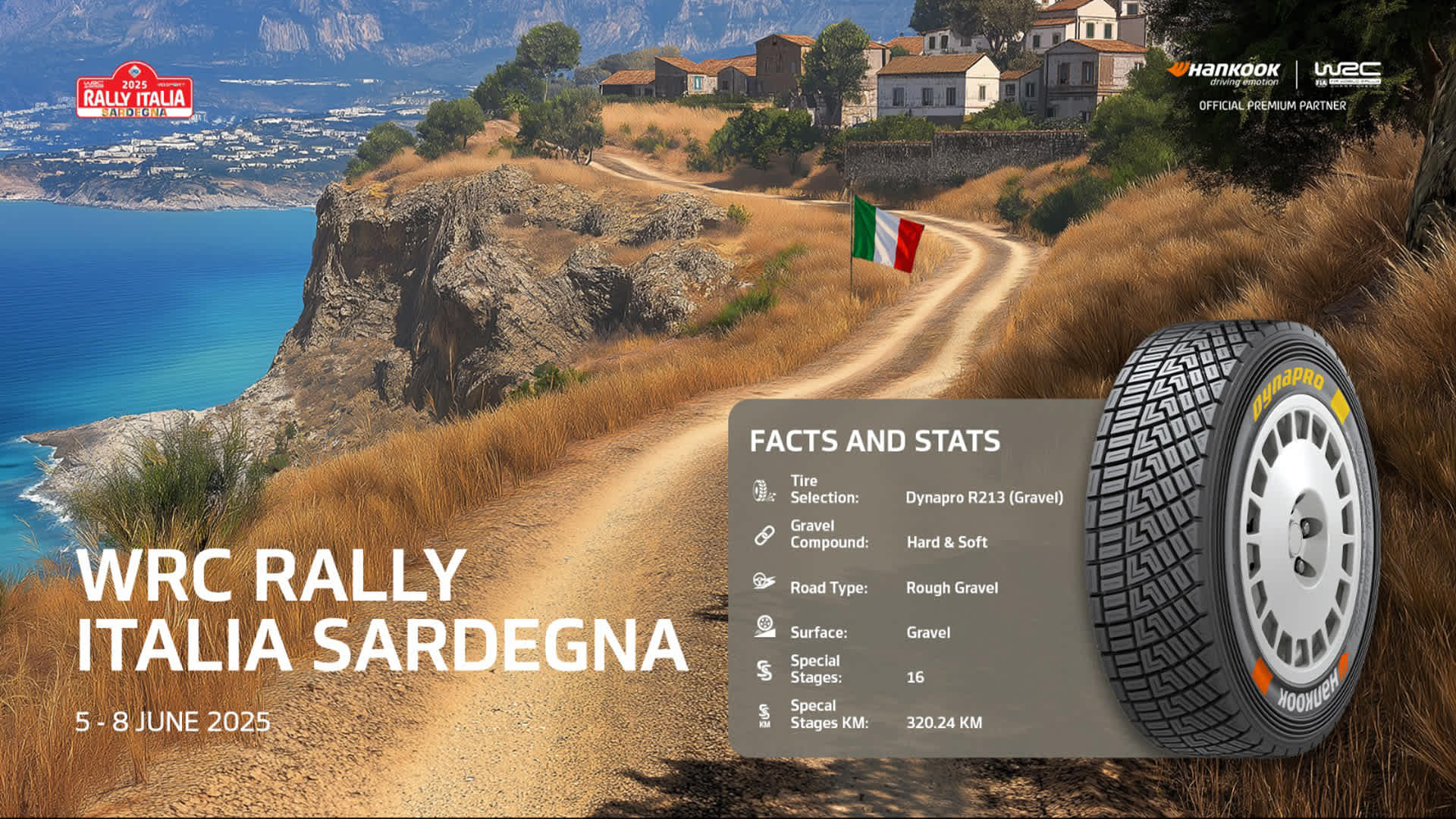 Based in Olbia, rugged and sun-baked gravel tracks in the north of the picture postcard Mediterranean island ensure one of the season’s sternest challenges. Fast and narrow stages leave no margin for error, while intense heat combines with abrasive roads to test tyres to the limit.